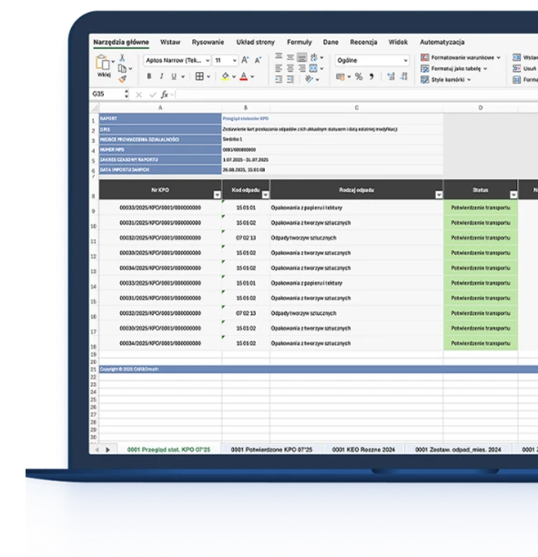 Jednym kliknięciem Excel automatycznie importuje kompletne informacje o odpadach w czytelnej, uporządkowanej formie. Co wcześniej zajmowało godziny – teraz trwa minuty.