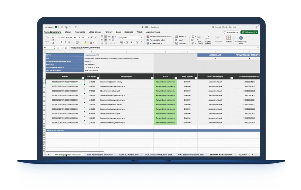 CARBOwaste BDO rozwiązuje te problemy, pobierając dane bezpośrednio z BDO i przetwarzając je w dobrze znanym środowisku Excel. Dzięki automatyzacji i integracji z bazą BDO, zyskujesz pełną kontrolę nad danymi przy minimalnym nakładzie pracy.
