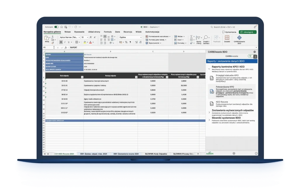 CARBOwaste BDO działa jako dodatek do Excela – nie musisz uczyć się nowego systemu. Wszystkie dane trafiają do arkusza po jednym kliknięciu i są gotowe do analizy.